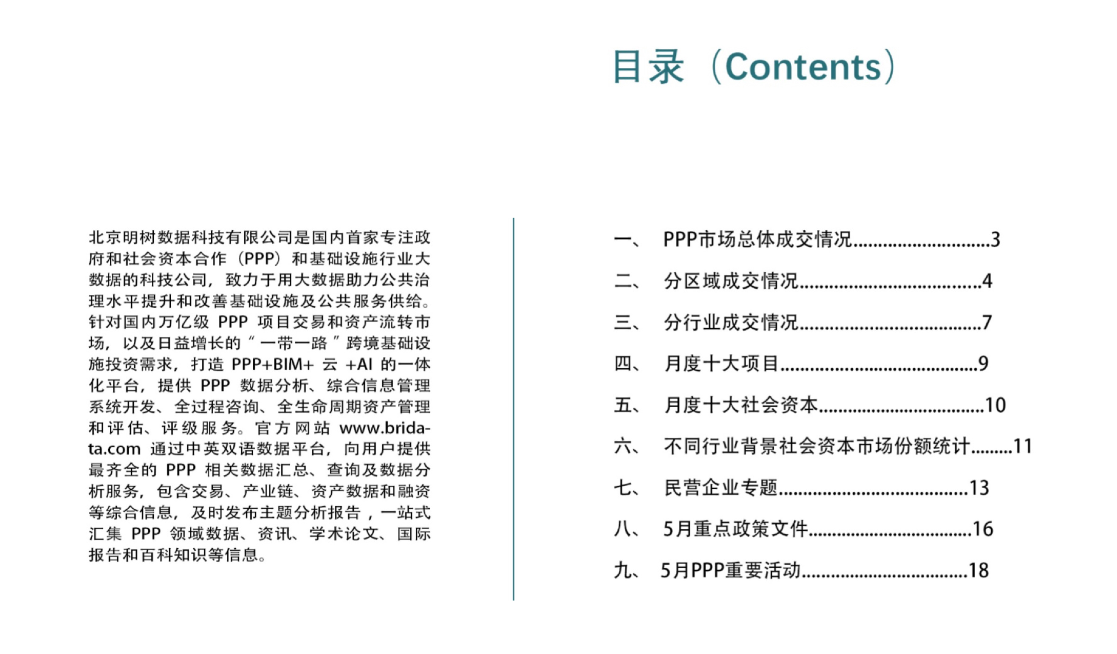 北京明樹數(shù)據(jù)科技有限公司獨(dú)家每月向市場發(fā)布全國PPP市場的最新動態(tài),數(shù)據(jù)包括項(xiàng)目成交金額、分區(qū)域項(xiàng)目成交狀況、分行業(yè)項(xiàng)目成交狀況、當(dāng)月十大項(xiàng)目和十大社會資本,以及民營企業(yè)參與PPP的數(shù)據(jù)專欄,并提供最新PPP相關(guān)政策文件介紹和PPP重要活動介紹。