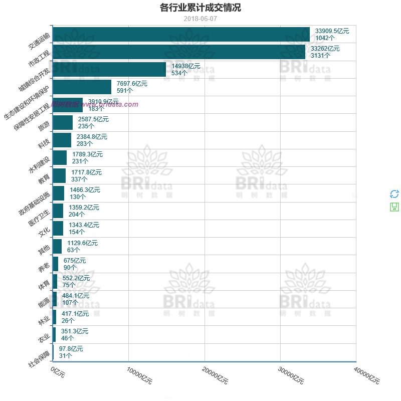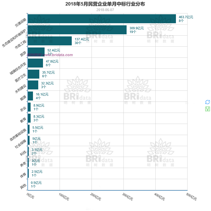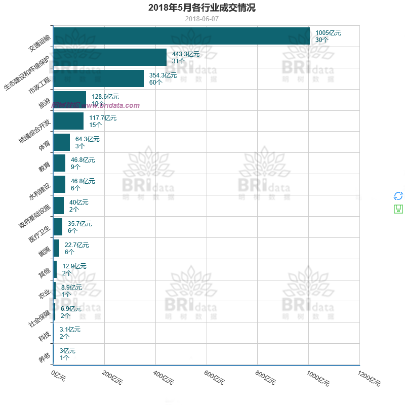 本月交通運(yùn)輸行業(yè)以1005億元的成交金額占據(jù)了行業(yè)成交榜的首位,生態(tài)環(huán)境行業(yè)和市政工程行業(yè)也貢獻(xiàn)了較大的成交份額。具體如下圖所示: