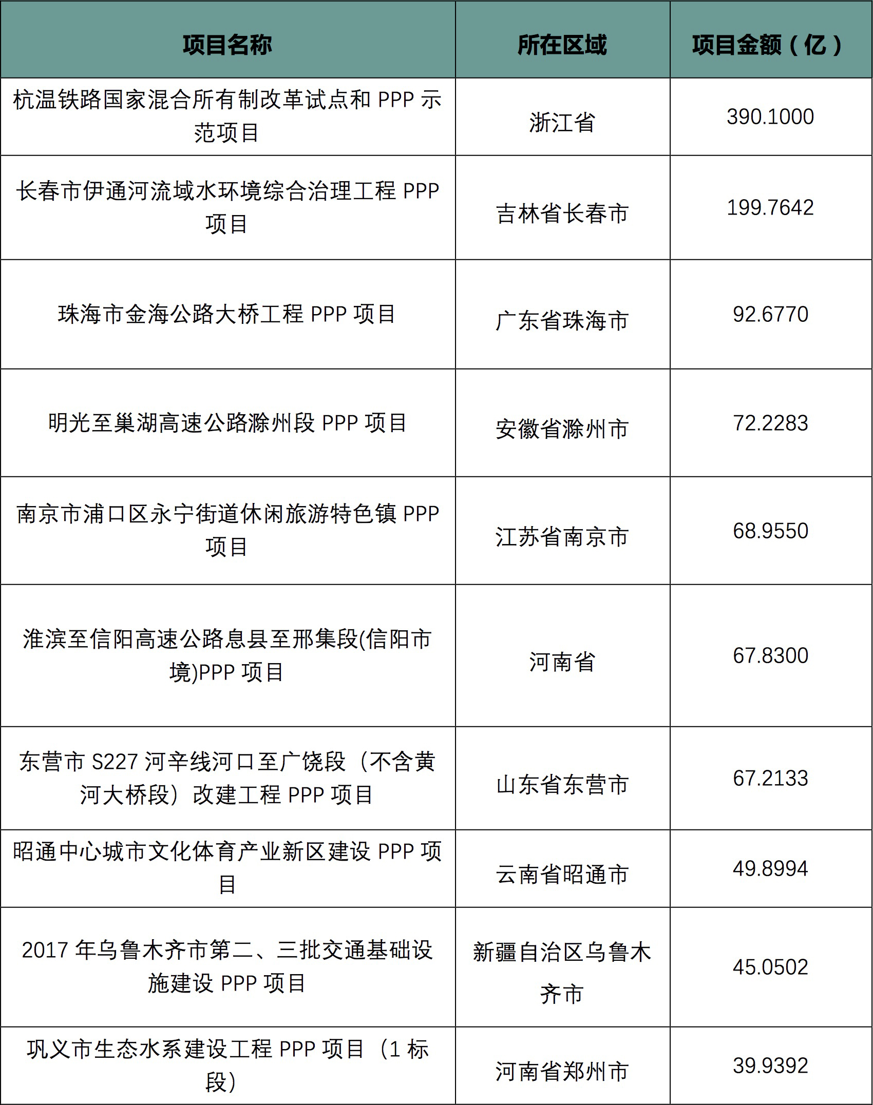 本月中標(biāo)規(guī)模最大的項(xiàng)目為杭溫鐵路國家混合所有制改革試點(diǎn)和PPP示范項(xiàng)目,項(xiàng)目規(guī)模達(dá)到了390.1億。本月成交規(guī)模排名前十的項(xiàng)目分別為: