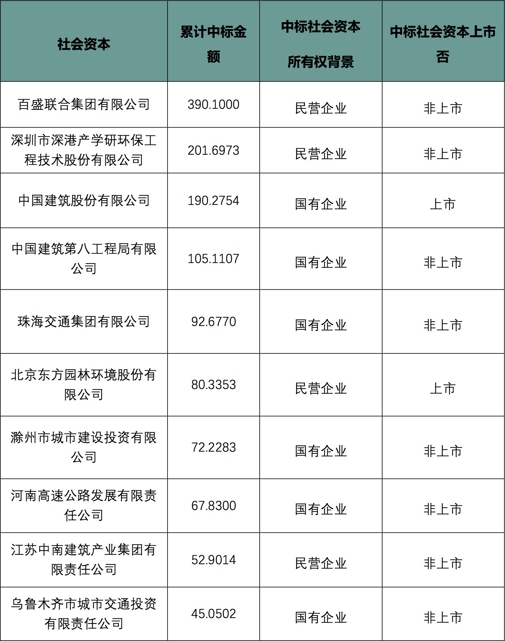 本月百盛聯(lián)合集團(tuán)有限公司以累計(jì)390.1億元的中標(biāo)金額在市場力壓群雄。排名前10的社會資本分別為(以下僅統(tǒng)計(jì)社會資本作為牽頭人或者單獨(dú)中標(biāo)的業(yè)績):