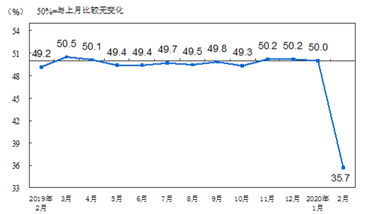 受疫情影響,2020年2月份制造業(yè)PMI為35.7%,比上月下降14.3個(gè)百分點(diǎn)。